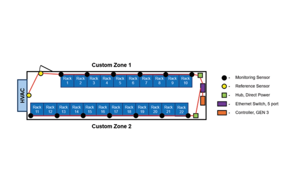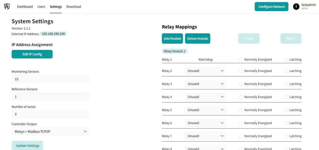- Sensing node terhubung melalui hub dan switch ke controller, yang berfungsi sebagai pusat pengelolaan dan pemantauan seluruh sistem. Controller dilengkapi dengan relay dan output Modbus TCP/IP yang dapat diintegrasikan dengan BMS atau sistem kontrol lainnya.